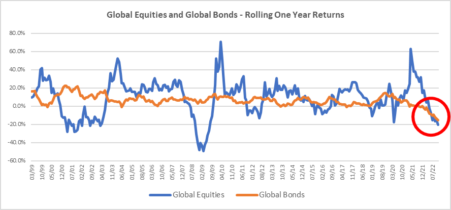 Losses are comparable with 2008 but have been generated in a very different manner. During the Global Financial Crisis equity returns were far worse, but some protection was provided by falling bond yields. In 2022, equity losses have not (yet) been comparable, but bond exposure has compounded investor problems, not mitigated them: