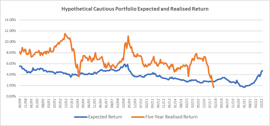 Over recent years a combination of falling bond yields and rising equity valuations has meant that cautious investors earnt returns that were higher than might have been reasonably anticipated from the cash flow prospects of their investments. We can visualise this by looking at a simple yield-based expected return for the hypothetical cautious portfolio (calculated by combining the earnings yield on equities with the yield to worst on bonds)** with the subsequent five year return delivered: