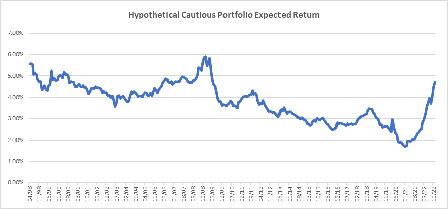 Rather than attempt to make such heroic forecasts, it is more prudent to look at areas where we can have greater confidence. The weakness in bonds and equities through 2022 means that our expected long-term returns for a typical cautious portfolio have improved significantly:
