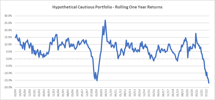 First, it is important to consider how rare the returns delivered in 2022 are for conservatively allocated investors. If we go back to 1999 – before the bursting of the tech bubble – and look at the one-year returns of a simple, hypothetical cautious portfolio (70% global bonds / 30% equities) * we can see how extreme the environment has been: